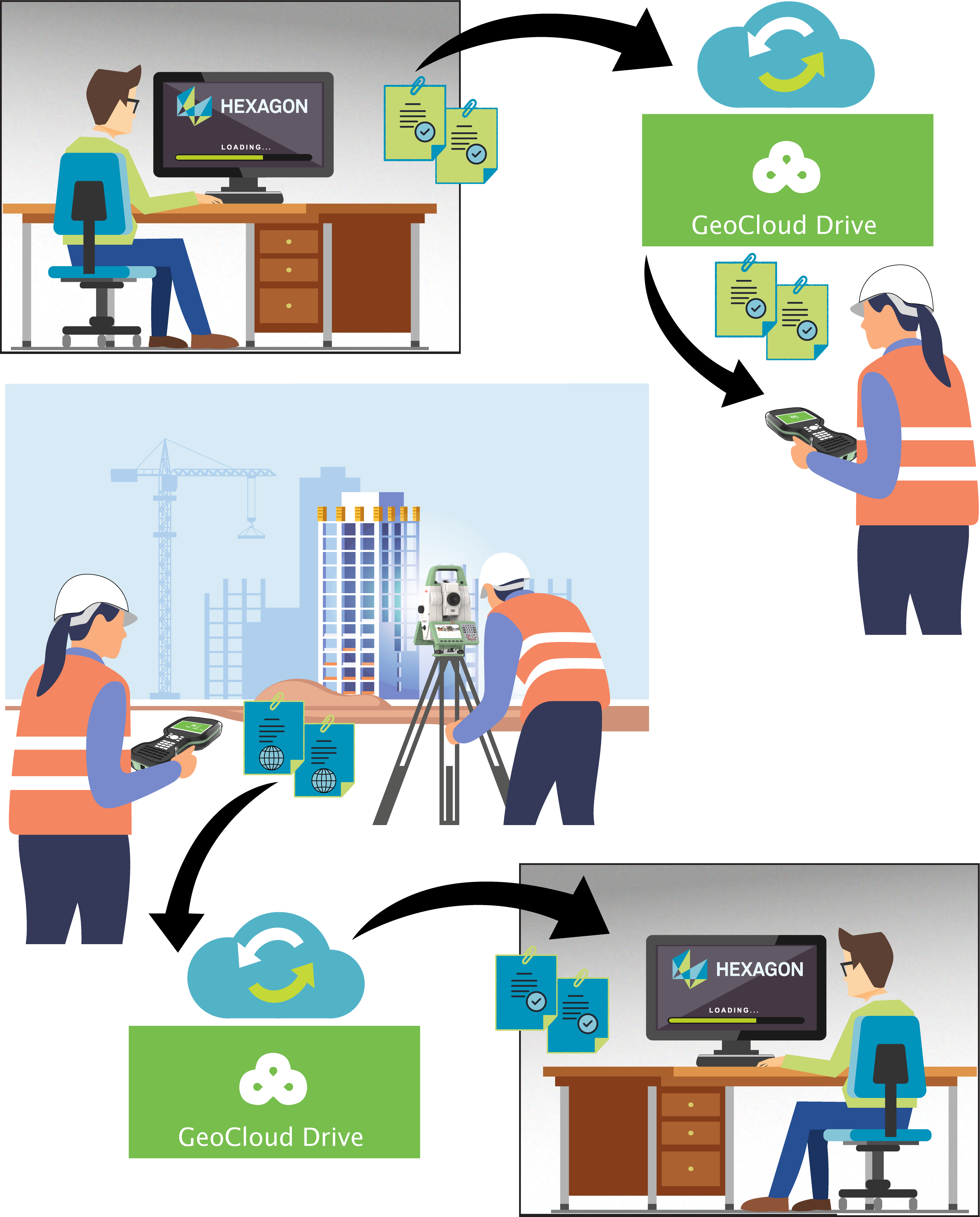 En bruger på kontoren gemmer designdata i en mappe, som hører til i en projektmappe på GeoCloud Drive. Ændringerne i denne mappe bliver automatisk synkroniseret til skylageret. Brugeren i felten henter designdataene i Leica Captivate. Når arbejdet i felten er gennemført, overfører brugeren i felten resultaterne af dagens arbejde. En anden kontorbruger åbner mappen med det pågældende projekt, som allerede indeholder de synkroniserede data fra felten. Brugeren kan behandle disse data yderligere ved hjælp af valgfri kontorsoftware.