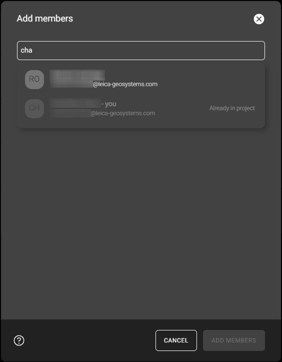 Kun brugere, der er knyttet til GeoCloud Drive-abonnementet i myWorld, vises som mulige projektmedlemmer.