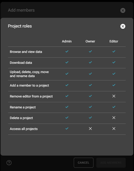 Brugere, der er knyttet til GeoCloud Drive-abonnementet som Admin i myWorld, tilføjes automatisk som projektmedlemmer med rollen Admin. De kan ikke fjernes fra projektet.